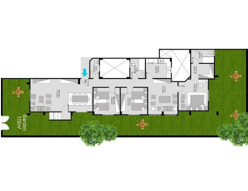 Enchanting three bedroom, three bath home with spacious one bedroom, one bath cabana, in-laws quarters. Charming living area features fireplace and fabulous art deco details. Formal dining room.